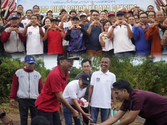 Foto: Bupati Klungkung I Made Satria mendampingi Gubernur Bali I Wayan Koster memimpin aksi penanaman 1.000 bibit pohon kelapa daksina di Embung Tulad Unda, Desa Gunaksa, Kecamatan Dawan, Jumat (27/2/2026).