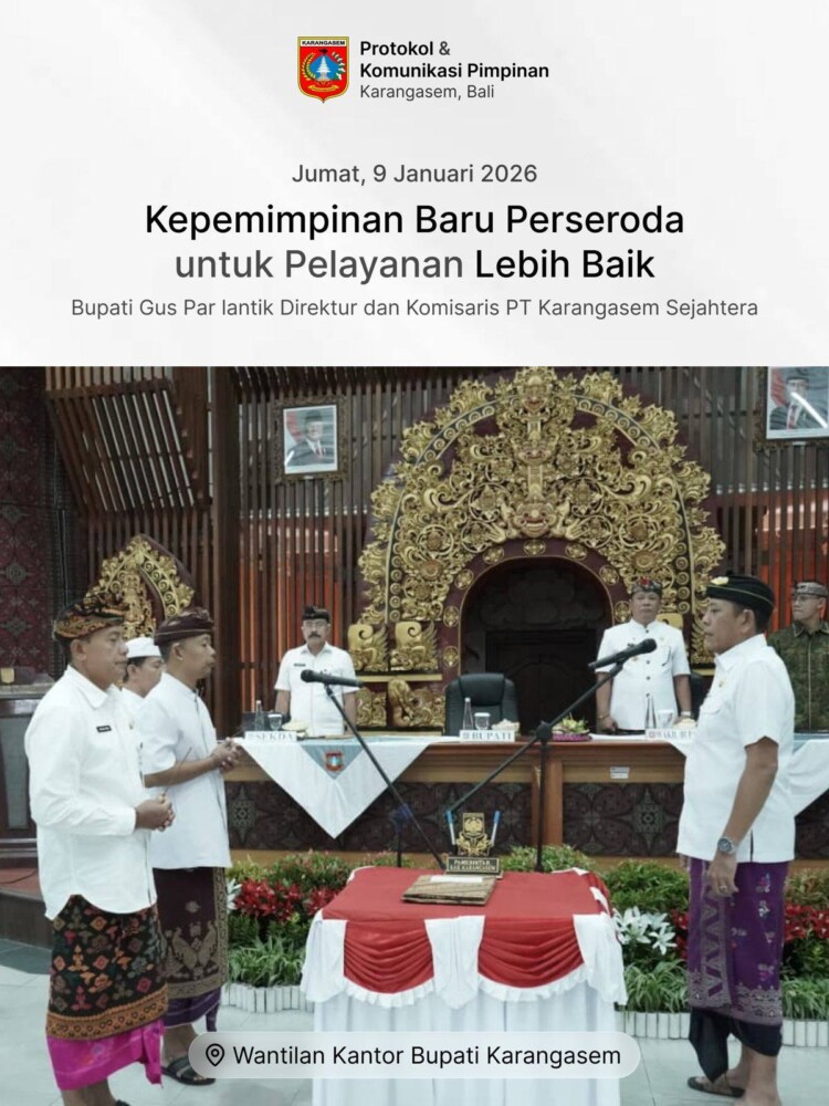 Bupati Karangasem I Gusti Putu Parwata resmi melantik jajaran Komisaris dan Direktur PT Karangasem Sejahtera (Perseroda), Jumat (9/1/2026). Pelantikan ini menandai langkah strategis Pemerintah Kabupaten Karangasem dalam memperkuat peran badan usaha milik daerah sebagai motor pelayanan publik sekaligus pengungkit Pendapatan Asli Daerah (PAD).