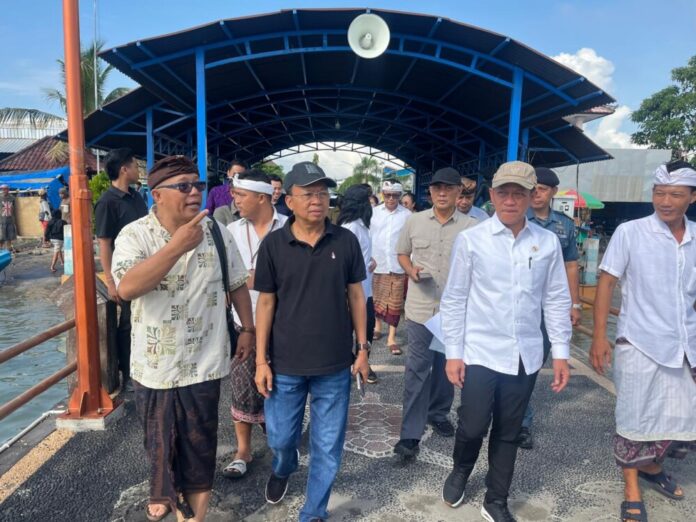 Foto: Menteri Lingkungan Hidup dan Kehutanan (LHK) RI Hanif Faisol Nurofiq didampingi Gubernur Bali Wayan Koster meninjau lokasi Terminal LNG Bali Offshore di Pantai Sidakarya, Kota Denpasar, pada Selasa (27/5/2025).