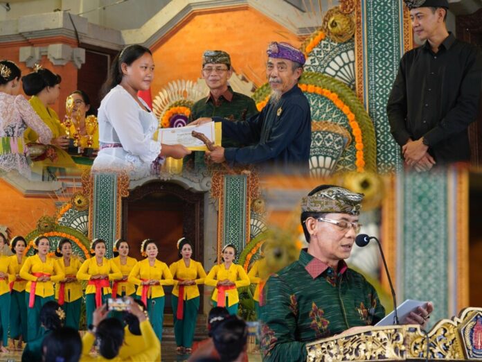 Foto: Bupati Klungkung, I Made Satria bersama Wakil Bupati Klungkung, Tjokorda Gde Surya Putra menghadiri Puncak HUT ke-38 Wanita Hindu Dharma Indonesia (WHDI) Kabupaten Klungkung di Balai Budaya Ida Dewa Istri Kanya, Kabupaten Klungkung, Minggu (8/2/2026).