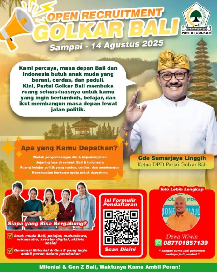 DPD Partai Golkar Provinsi Bali secara resmi membuka rekrutmen kader muda yang berlangsung hingga 14 Agustus 2025. Program ini merupakan komitmen nyata Ketua DPD Golkar Bali Gde Sumarjaya Linggih, atau yang akrab disapa Demer, dalam mewujudkan partai yang modern dan ramah bagi generasi muda. Langkah ini menjadi bagian dari transformasi Partai Golkar Bali menuju partai yang lebih terbuka, adaptif terhadap perubahan zaman, dan relevan dengan kebutuhan generasi Milenial dan Gen Z.