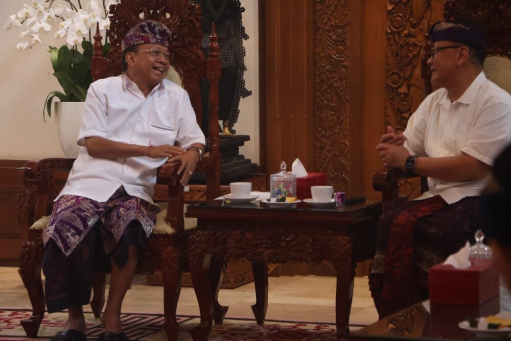 Foto: Gubernur Bali Wayan Koster saat menerima kunjungan Pelaksana Tugas (Plt) Direktur Utama PT Jasa Raharja Rubi Handojo Beserta jajaran di Jayasabha, Denpasar pada Kamis ( 22/5) sore.
