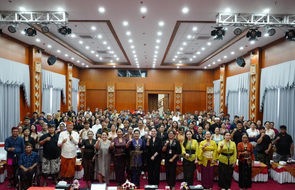 Foto: Ketua Dewan Kerajinan Nasional Daerah (Dekranasda) Provinsi Bali, Ibu Putri Koster bersama para pengerajin IKM Bali Bangkit di Gedung Kertha Sabha, Jayasabha, Denpasar, Rabu (8/1/2026).