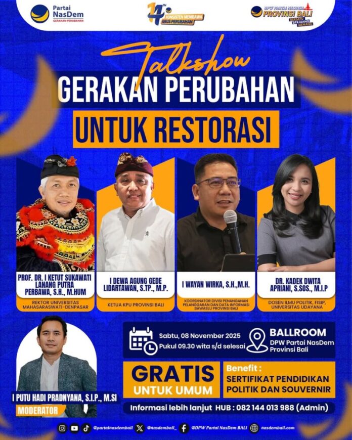 DPW Partai NasDem Provinsi Bali menyambut HUT ke-14 Partai NasDem dengan menggelar Talkshow Gerakan Perubahan untuk Restorasi, sebuah forum diskusi publik yang ditujukan untuk memperkuat literasi politik masyarakat dan meneguhkan komitmen partai terhadap agenda perubahan. Acara ini akan berlangsung pada Sabtu, 8 November 2025, di Ballroom DPW NasDem Bali, Renon–Denpasar.