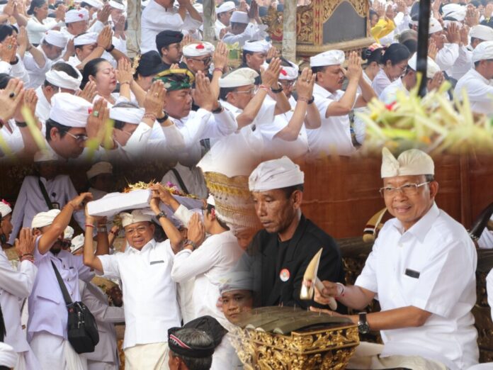 Hadir langsung dalam momen sakral tersebut, Gubernur Bali Wayan Koster didampingi Sekretaris Daerah Provinsi Bali Dewa Made Indra. Namun kehadiran Koster tak sekadar seremonial. Di sela prosesi, ia turut ngayah dengan memainkan gamelan gangsa—sebuah aksi “megambel” yang spontan menyatu dengan denyut spiritual umat.