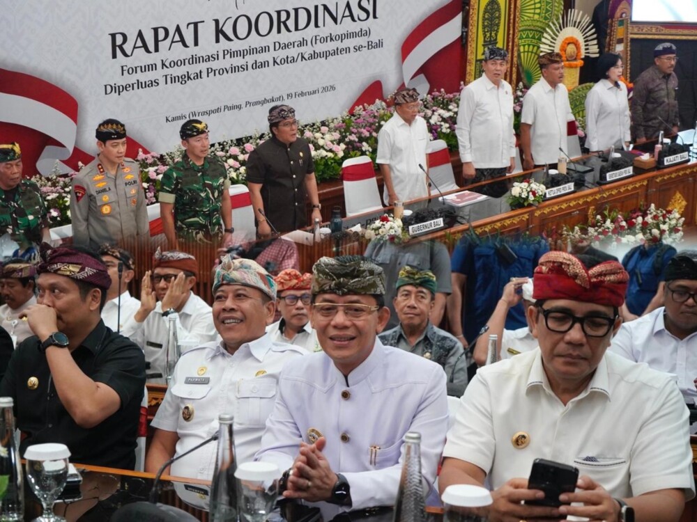 Bupati Klungkung I Made Satria menghadiri Rapat Koordinasi Forum Koordinasi Pimpinan Daerah (Forkopimda) Diperluas tingkat provinsi serta kabupaten/kota se-Bali. Kegiatan ini berlangsung di Gedung Wiswa Sabha Utama, Kantor Gubernur Bali, Kamis (19/2/2026).