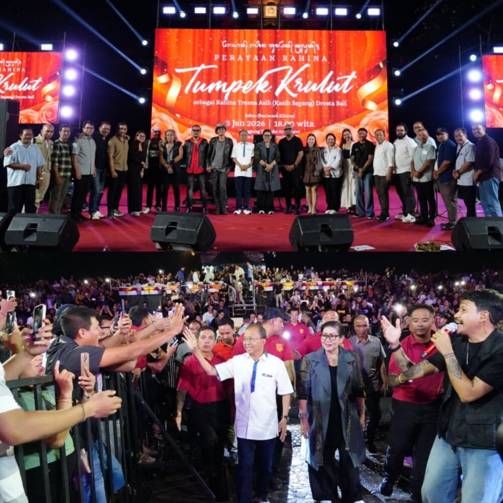 “Selamat merayakan Rahina Tumpek Krulut hari ini, hari raya kasih sayang Dresta Bali,” ucapnya di hadapan ribuan penonton.