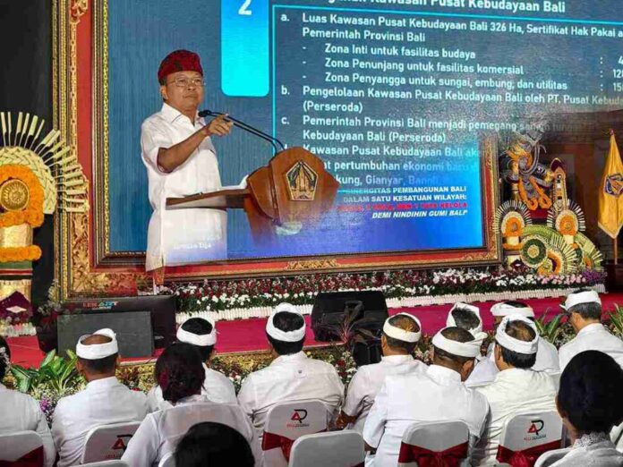 Gubernur Bali, Wayan Koster, memberikan arahan tegas dalam kegiatan Pengarahan Gubernur Bali tentang Percepatan Pelaksanaan Program 2025–2030 yang digelar di Wantilan Pura Samuan Tiga, Gianyar, Kamis (10/7). Salah satu poin penting yang ditekankan adalah percepatan dan pemantapan pelaksanaan rencana aksi Peraturan Daerah Provinsi Bali Nomor 10 Tahun 2019 tentang Penyelenggaraan Ketenagakerjaan.