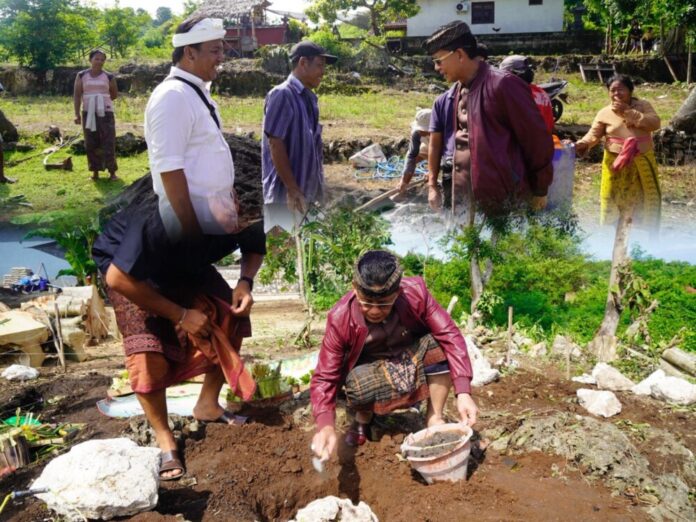 Foto : Bupati Klungkung, I Made Satria didampingi Kadis Sosial P3A Kabupaten Klungkung, I Gusti Agung Gede Putra Mahajaya melakukan peletakan batu pertama tanda dimulainya pembangunan bantuan bedah rumah untuk empat warga kurang mampu di Kecamatan Nusa Penida, Kabupaten Klungkung, Sabtu (3/1/2026).