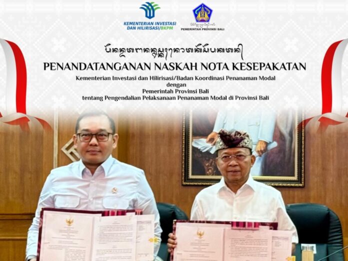 Pemerintah Provinsi Bali dan Kementerian Investasi dan Hilirisasi/BKPM RI resmi menandatangani Nota Kesepakatan tentang Pengendalian Pelaksanaan Penanaman Modal. Penandatanganan dilakukan Gubernur Bali Wayan Koster bersama Wakil Menteri Investasi dan Hilirisasi RI Todotua Pasaribu di Gedung Kertha Sabha, Jayasabha, Denpasar, Kamis (22/1/2026).