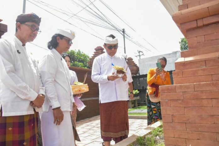 Foto : Walikota Denpasar, I Gusti Ngurah Jaya Negara bersama Ketua TP. PKK Kota Denpasar, Ny. Sagung Antari Jaya Negara serta Pj. Sekda Kota Denpasar, I Gusti Ngurah Eddy Mulya saat menghadiri sekaligus mendem dasar serangkaian Karya Melaspas Rumah Singgah, Dinas P3AP2KB yang dilaksanakan bertepatan Soma Pon Pahang, Senin (22/12/2025).